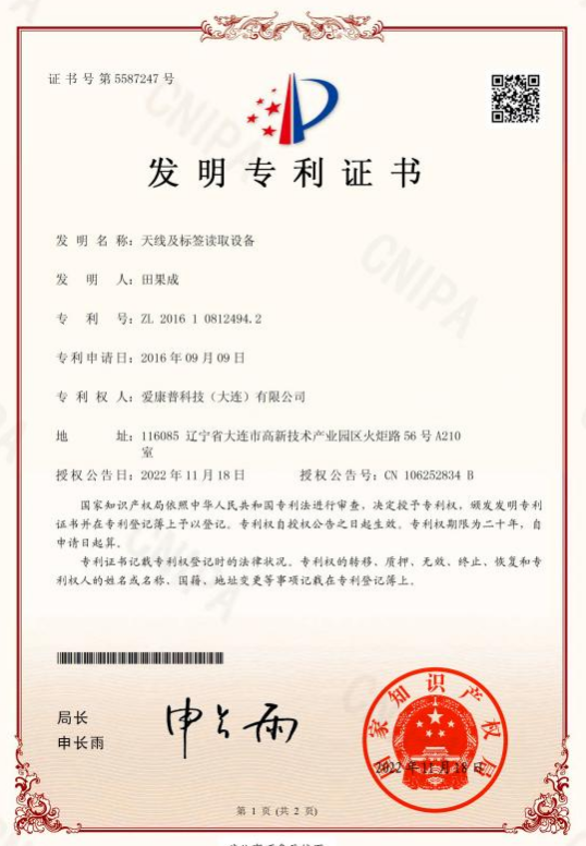 愛(ài)康普發(fā)明專(zhuān)利“天線(xiàn)及標(biāo)簽讀取設(shè)備”獲得國(guó)家知識(shí)產(chǎn)權(quán)局證書(shū),專(zhuān)利號(hào):ZL 201610812494.2,證書(shū)號(hào):5587247。